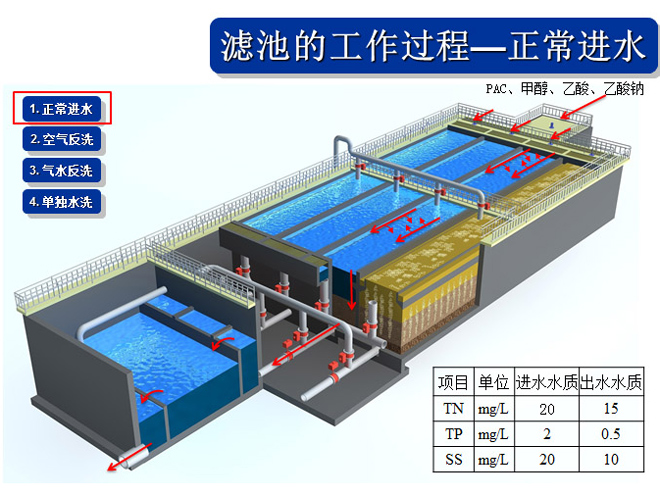 運(yùn)行模式在外加碳源情況下,則為具有反硝化功能的深床反硝化濾池,可以去除 TN、SS 和 TP。取消外加碳源情況下,則為深床濾池,可以同時(shí)去除SS和TP。