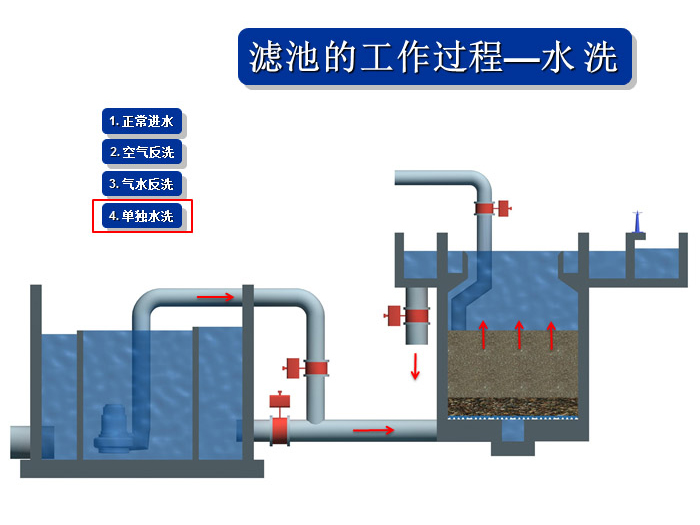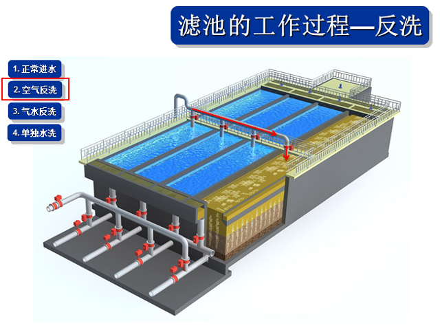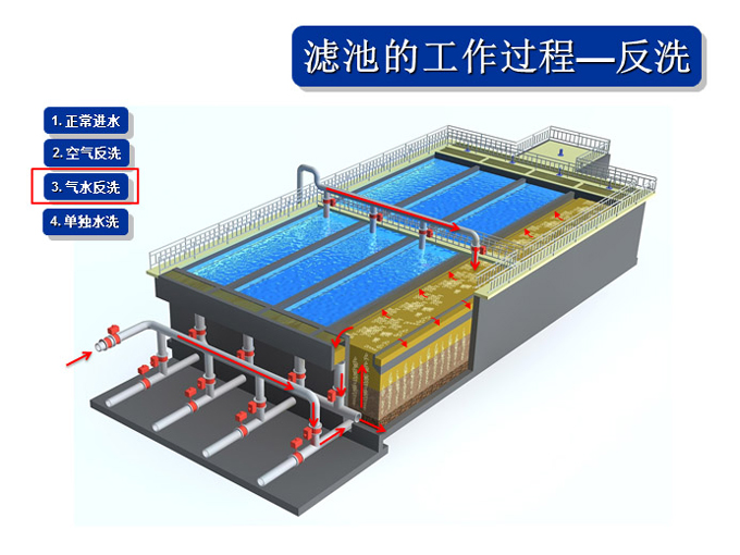 1、氣水聯(lián)合反沖冼裝置、布?xì)庋b置、操作工藝等系統(tǒng)集成技術(shù)解決直接過(guò)濾、生物濾池生物膜脫落堵塞濾池的問(wèn)題。