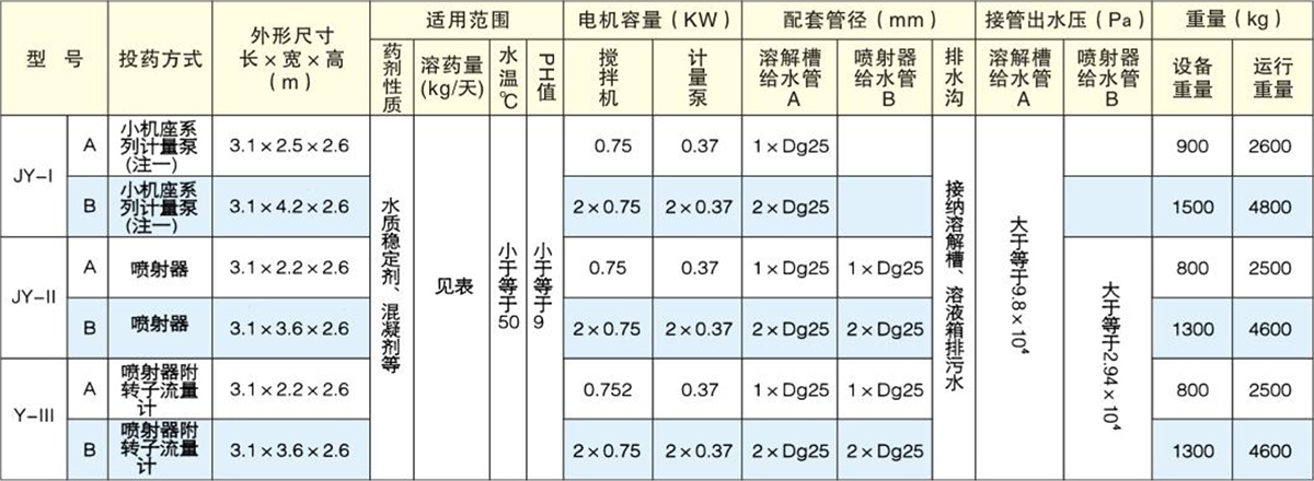 JY型加藥裝置三種型號都由三大部分組成:1、攪拌機;2、溶液槽;3、計量裝置及投加設(shè)備。