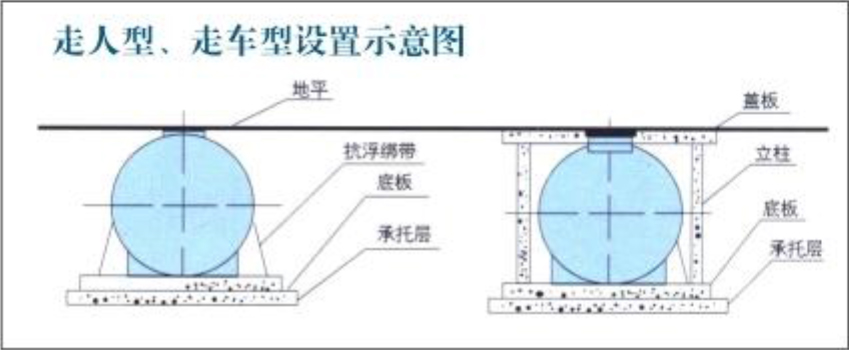說明:當(dāng)設(shè)備埋設(shè)于綠化地帶,上部只需行人時,設(shè)備基礎(chǔ)均布荷載為4t/m²以上,設(shè)備與基礎(chǔ)用抗浮綁帶連接,以防地下水把設(shè)備浮起。