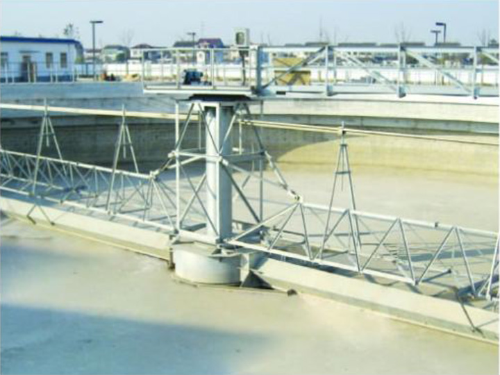 中心傳動吸泥機(jī)主要由傳動結(jié)構(gòu)、中心豎架、吸泥架、刮泥架、刮泥板及撇渣機(jī)構(gòu)等組成。污水從周邊進(jìn)入配水槽,經(jīng)槽底配水孔均勻地流入沉淀池,在周邊進(jìn)水擋板的作用下,水流從池底部流向中心,并從上部返回四周的出水槽內(nèi)。周邊配水槽采用變斷面配水孔不均勻分布設(shè)計(jì),以保證周邊配水的均勻性,驅(qū)動裝置帶動固定在桁架上的變徑吸泥管沿池底緩慢旋轉(zhuǎn),由吸泥管上特殊設(shè)計(jì)的系列孔口以靜水壓力為動力將沉積在池底的污泥吸至吸泥管中,從排泥筒排出,浮渣刮板將沉淀池表面的浮渣刮至集渣斗,排出池外。
